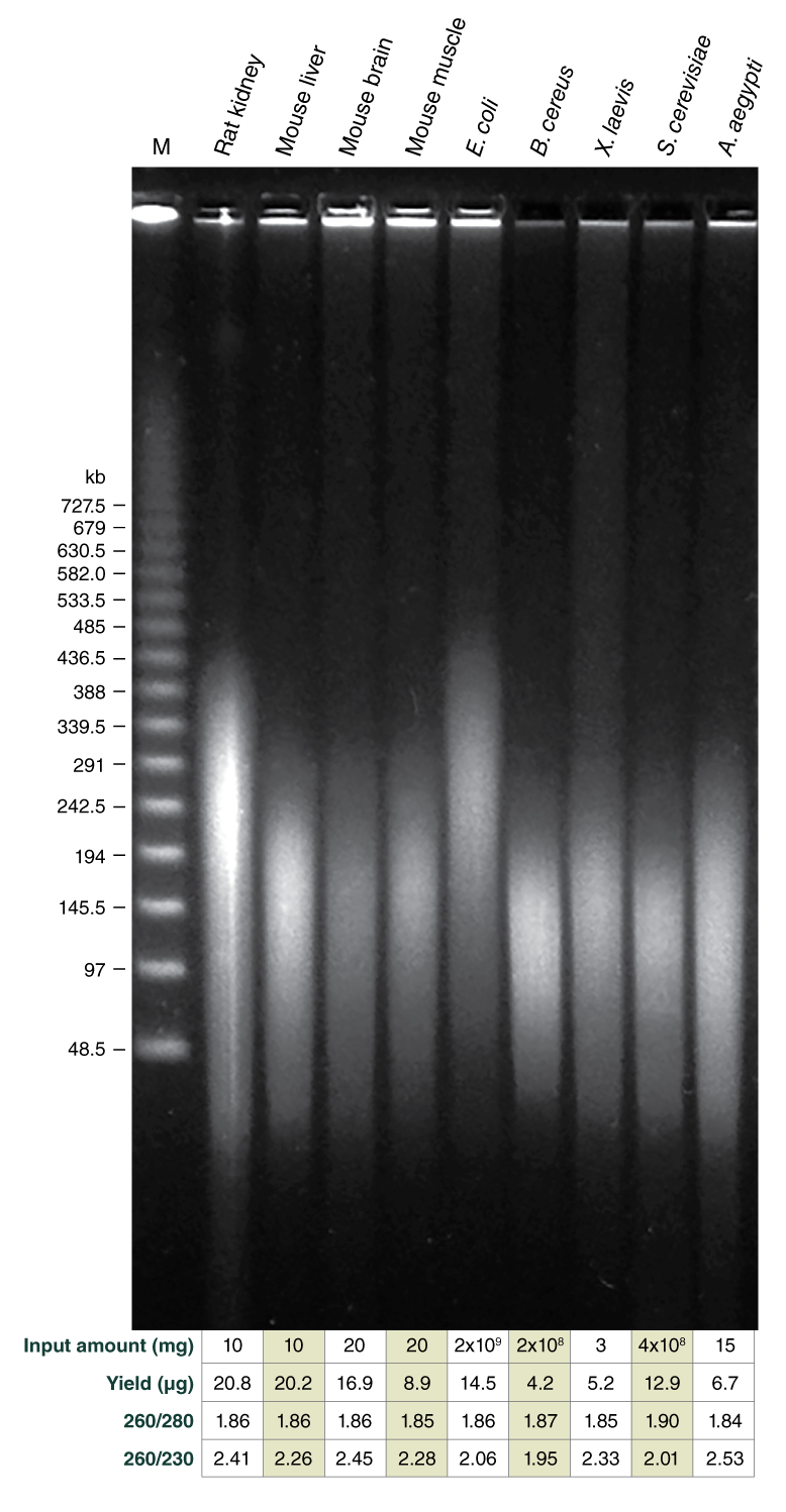 Figure 2: The Monarch HMW DNA Extraction Kit for Tissue efficiently purifies high-quality, HMW DNA from a variety of sample types